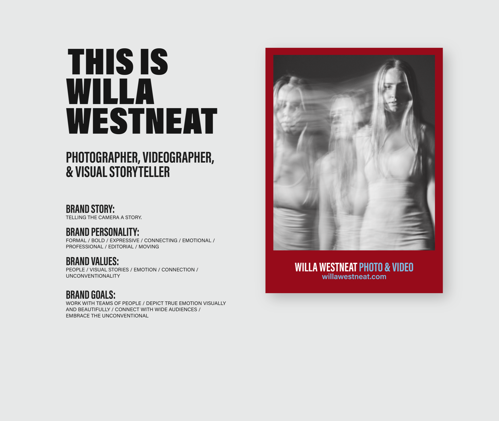 Logo design, visual identity system, and brand book for photographer and videographer, Willa Westneat.