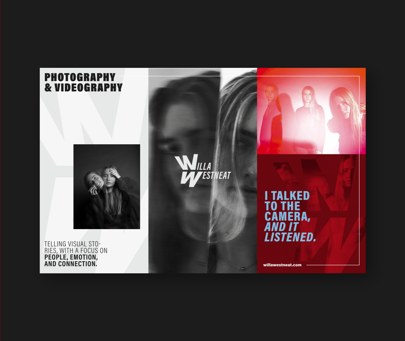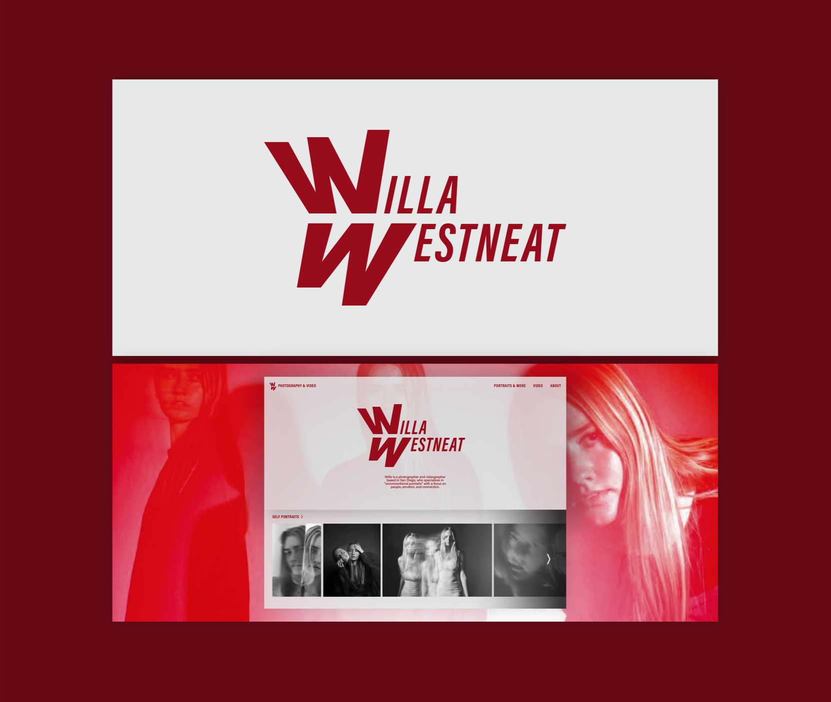 Willa is a photographer and videographer known for unconventional portraits that explore layered identity through multiple frames of a single subject. Drawing from this approach, I designed a logo and visual identity that mirrors this dimensionality, reflecting the complexity and nuance of her work.